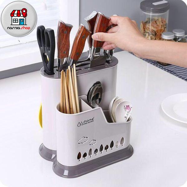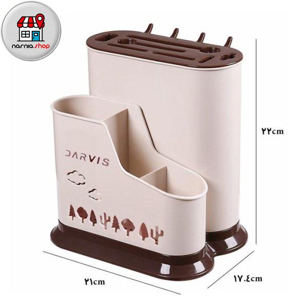 قسمت جلویی استند محفظه ای قرار دارد که از سه بخش با ارتفاع مختلف تشکیل شده است که می توان از آن برای قرار دادن قاشق، چنگال، چاقو و…. با سایزهای مختلف استقاده نمود و وسایل را به تفکیک از هم درون آن قرار داد تا در صورت نیاز به راحتی در دسترستان باشد.