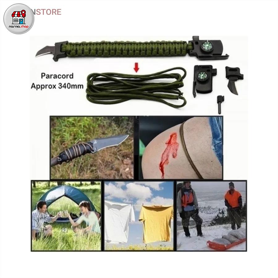 دستبند پاراکورد و نجات دارای وسایل ضروری برای بقا در طبیعت است، به وسیلۀ این دستبند می‌‌توانید به راحتی آتش روشن کنید، از ارتفاع پایین بیایید، مسیریابی کنید، ماهیگیری انجام دهید و… اگر به شکل دستبند پاراکورد و نجات نگاه کرده باشید متوجه می‌‌شوید که مانند یک طناب است، جالب است بدانید که طناب پاراکورد ساخته شده برای چتربازی هم مورد استفاده قرار می‌‌گیرد و از مقاومت و استحکام بسیار بالایی برخوردار است. مقاومت بالای این طناب به میزانی است که می‌‌توانید یک وزنه‌‌ی 200 کیلوگرمی را بدون نگرانی به آن متصل کنید، از طناب پاراکورد علاوه بر چتربازی می‌‌توان در ماهیگیری، بند آوردن خونریزی، درست کردن آتش،  فرود آمدن از ارتفاع، طناب نگهدارنده‌‌‌‌ی چادر، درست کردن پناهگاه و… نیز استفاده کرد.دستبند پاراکورد و نجات معمولا از 7 تا 9 رشته طناب با طولی 3 تا 4 متری تشکیل شده است که می‌‌توان برای مصارف مختلف در سفر از آن استفاده کرد. دارای ضروریات مربوط به یک سفر بوده و همچنین می‌‌تواند به دلیل زیبایی آن نیز مورد استفاده قرار گیرد، این وسیلۀ کاربردی می‌‌تواند کادوی بسیار مناسبی برای افرادی باشد که بسیار در طبیعت سفر می‌‌کنند. قطب نما، سوت اضطراری این سوت سطح سر و صدا را می‌تواند تا 110 db ایجاد کند و به امدادگران سیگنال دهد و چاقو که برای برش طناب و مواقع ضروری مورد استفاده قرار می‌گیرد و پشت چاقو در قسمت بالا هم دندانه‌هایی قرار دارد.